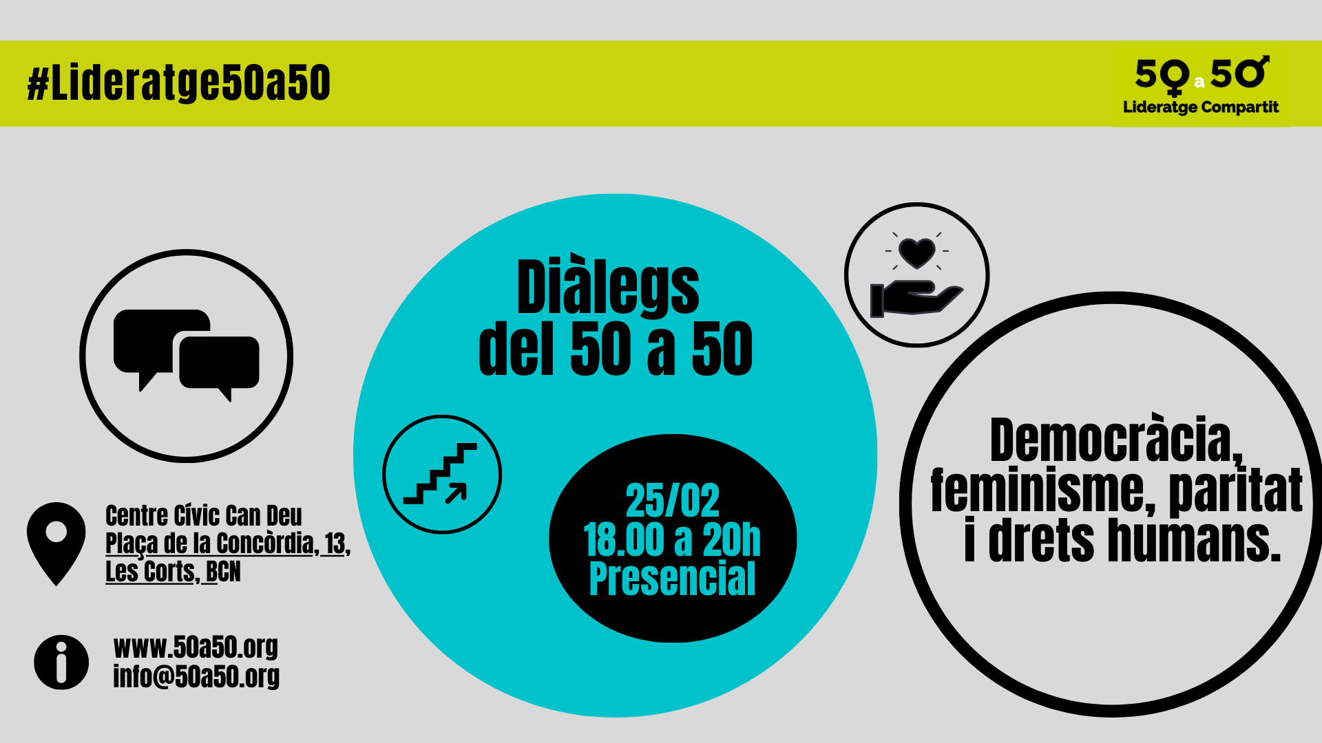 A 50a50 treballem per posar en valor el talent femení i aconseguir el 50% de representació femenina als llocs de presa de decisió d’institucions, organismes i empreses, perquè volem una societat més justa i igualitària.